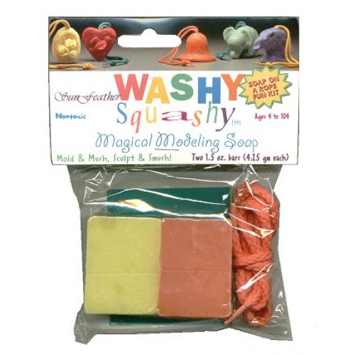 The Sunfeather magical modeling kit lets you create whatever soap-on-a-rope shape you can imagine! Comes with 3 ounces of Washy Squashy soap and rope. Note: This item comes in a sealed plastic bag with a display card. Identical to the boxed Washy Squashy except there is no round cardboard box. Qty:
