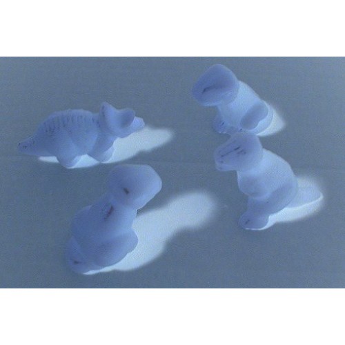 This is an assortment of four dinosaur shaped bath soaps that glow in the dark! This set of vegetable based soaps includes 4 fully formed creatures such as T-Rex & Triceratops for constant entertainment in the tub. Note: Expose to bright light for a half hour prior to use. Net weight: 3.5 oz.